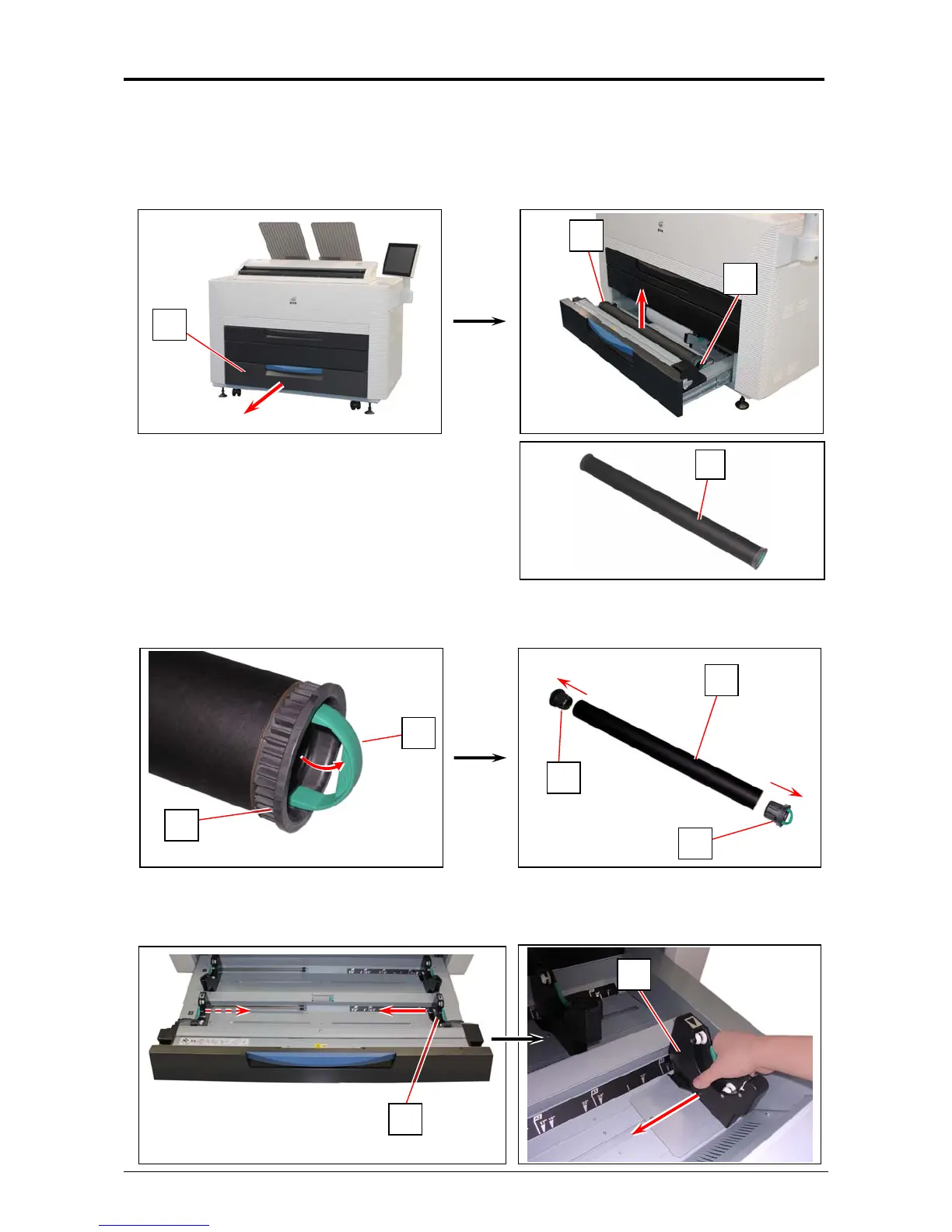 2. Pull the green lever (4) on each Flange (2), which releases the core of roll (3). Remove both