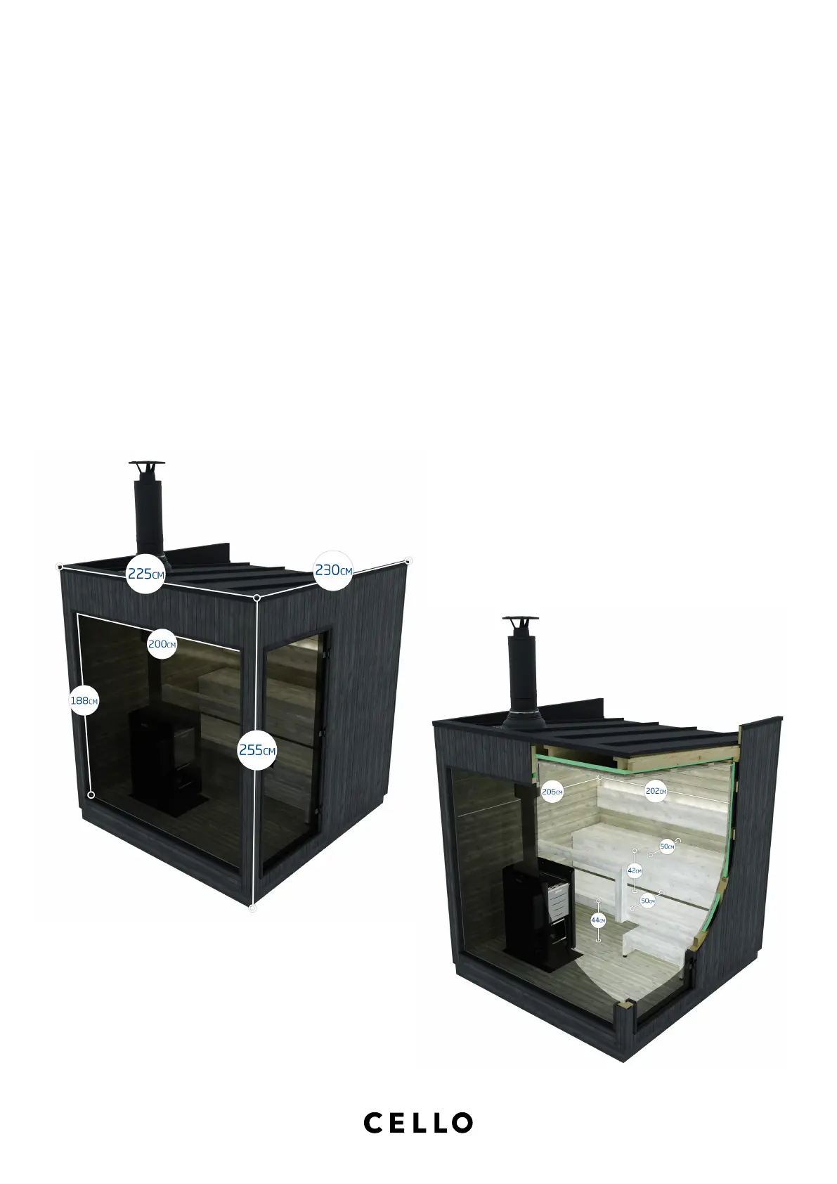 The surface area of the sauna is 2.3 by 2.25 metres, and