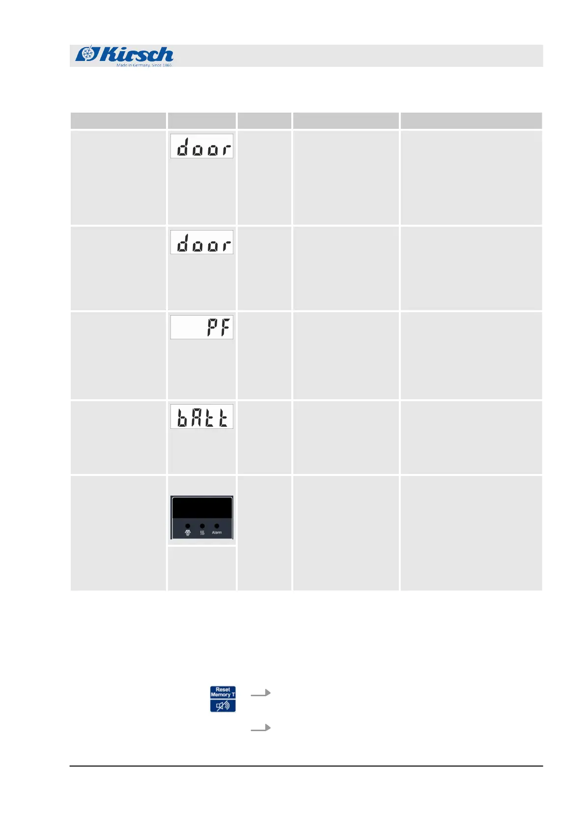 Alarm function Display Buzzer Cause Measure
