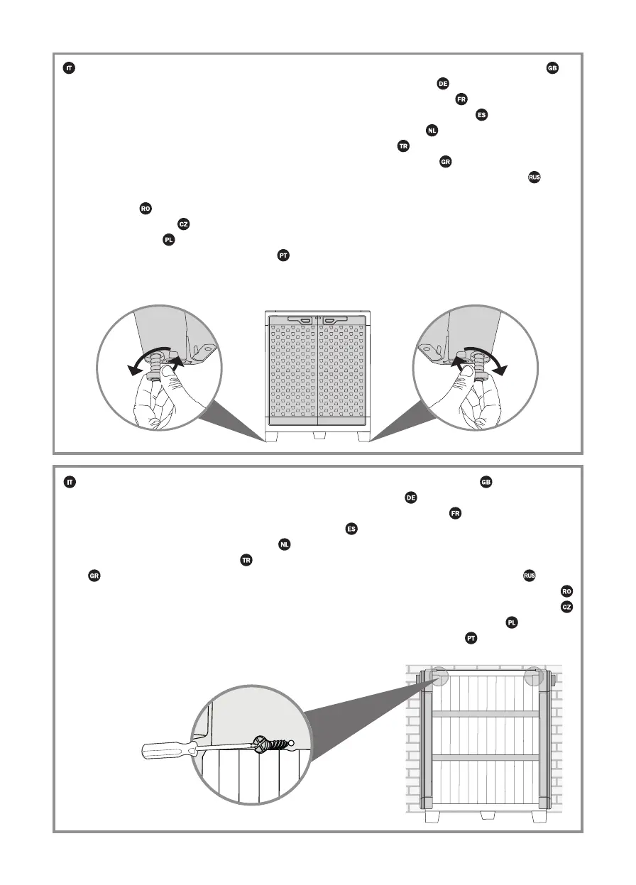 Per garantire maggiore stabilità dell’armadio su superfici irregolari, utilizzare le viti di regolazione poste sotto i piedi anteriori. For