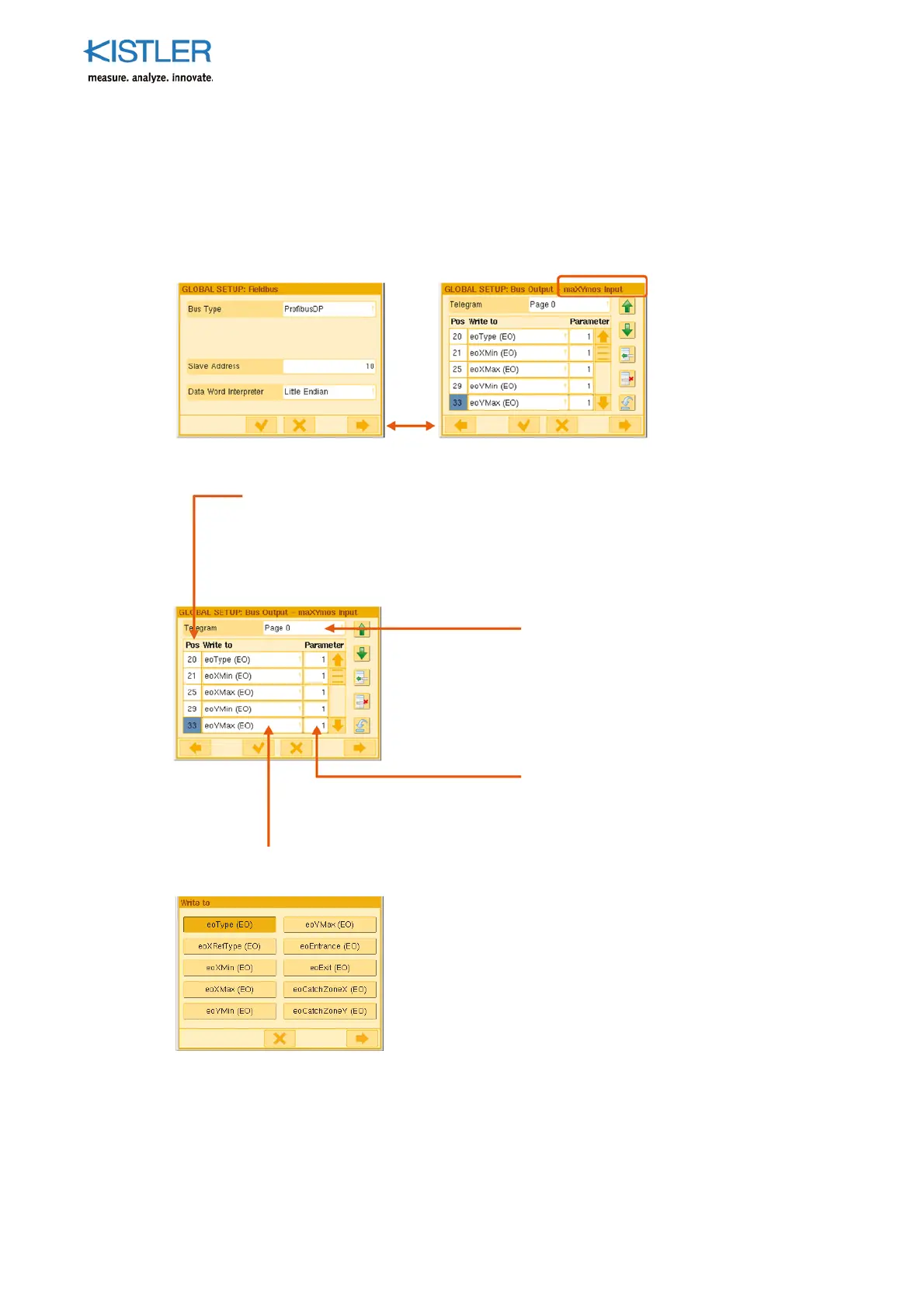 The input telegram is configured on the menu: GLOBAL SETUP: Data Bus Output –