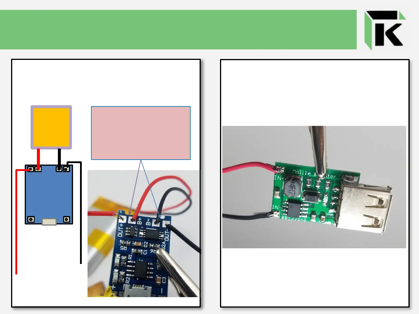 On the blue Micro USB Charging Module, solder