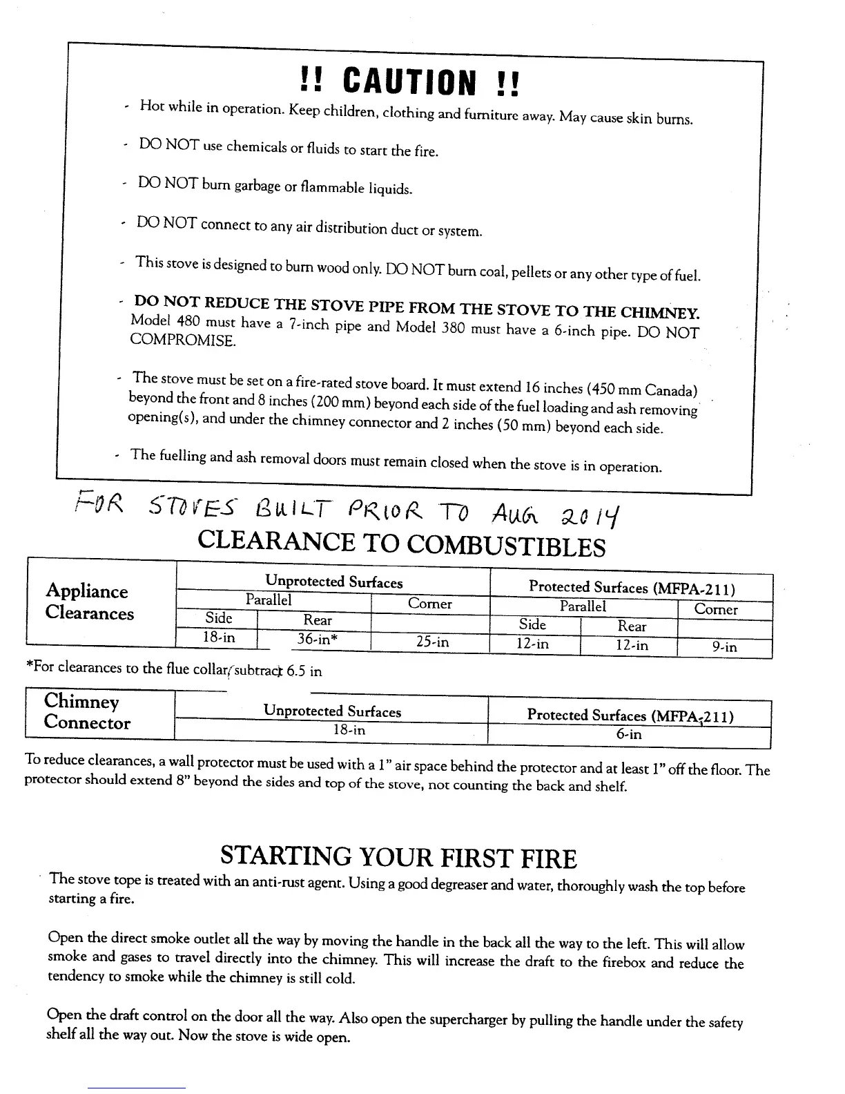 Kitchen Queen Stove - Safety Warnings for Older Stoves; Clearances for Older Stoves (Pre-August 2014); Appliance Clearances (Older Models); Chimney Connector Clearances (Older Models)