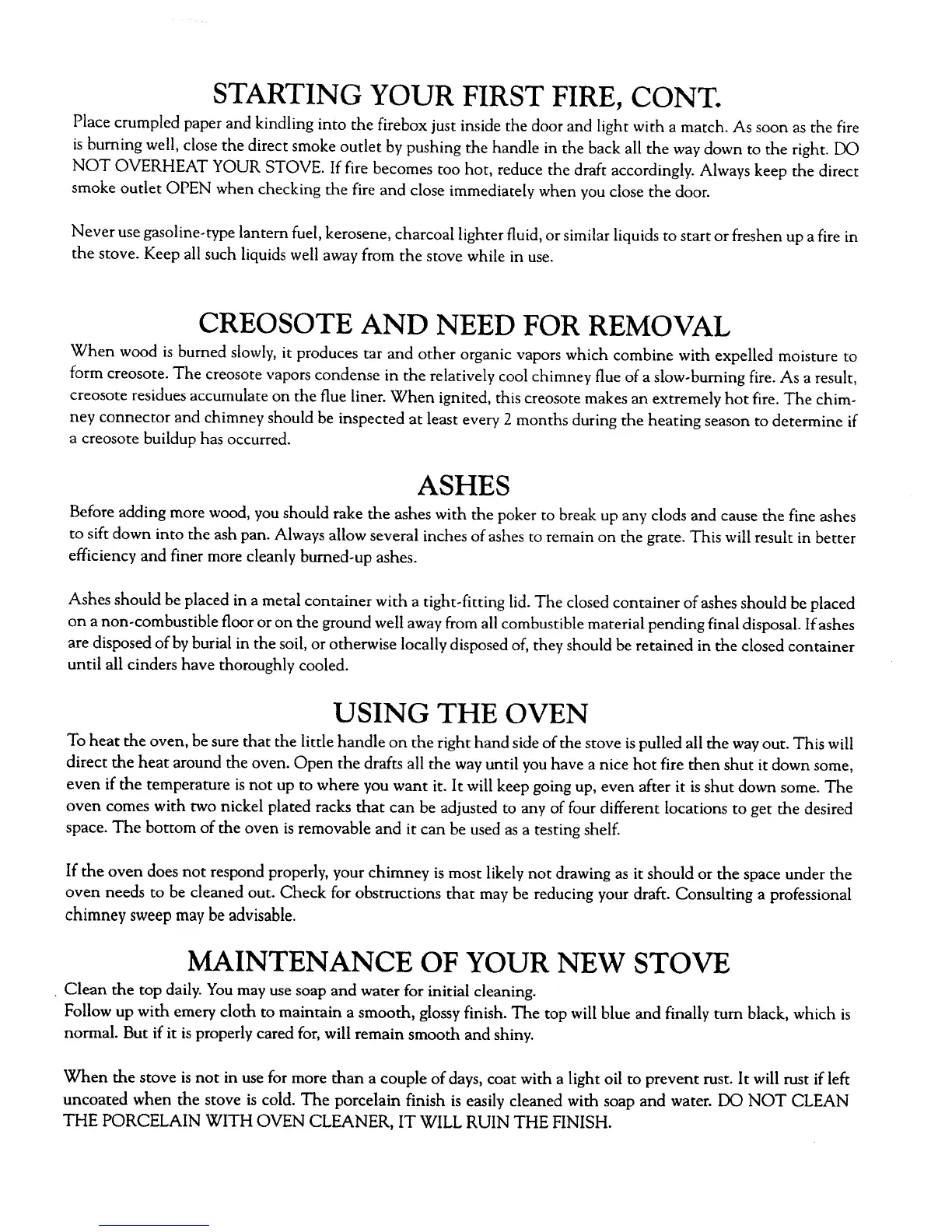 Kitchen Queen Stove - Operational Procedures and Maintenance; First Fire Continuation; Creosote Management; Ash Handling