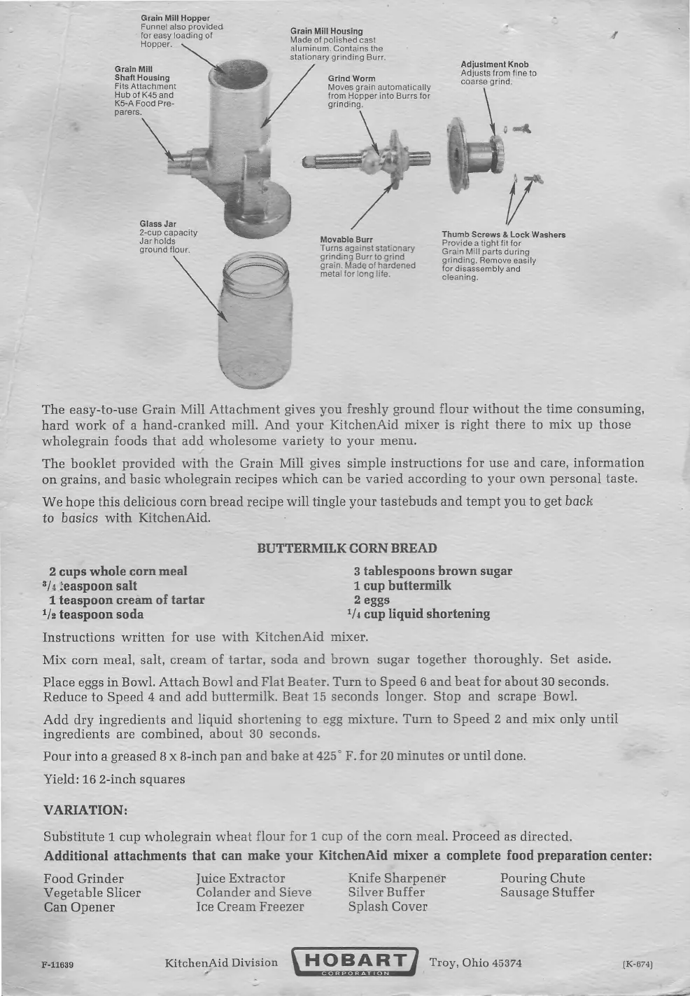 The easy-to-use Grain Mill Attachment gives you freshly ground flour without the time consuming,