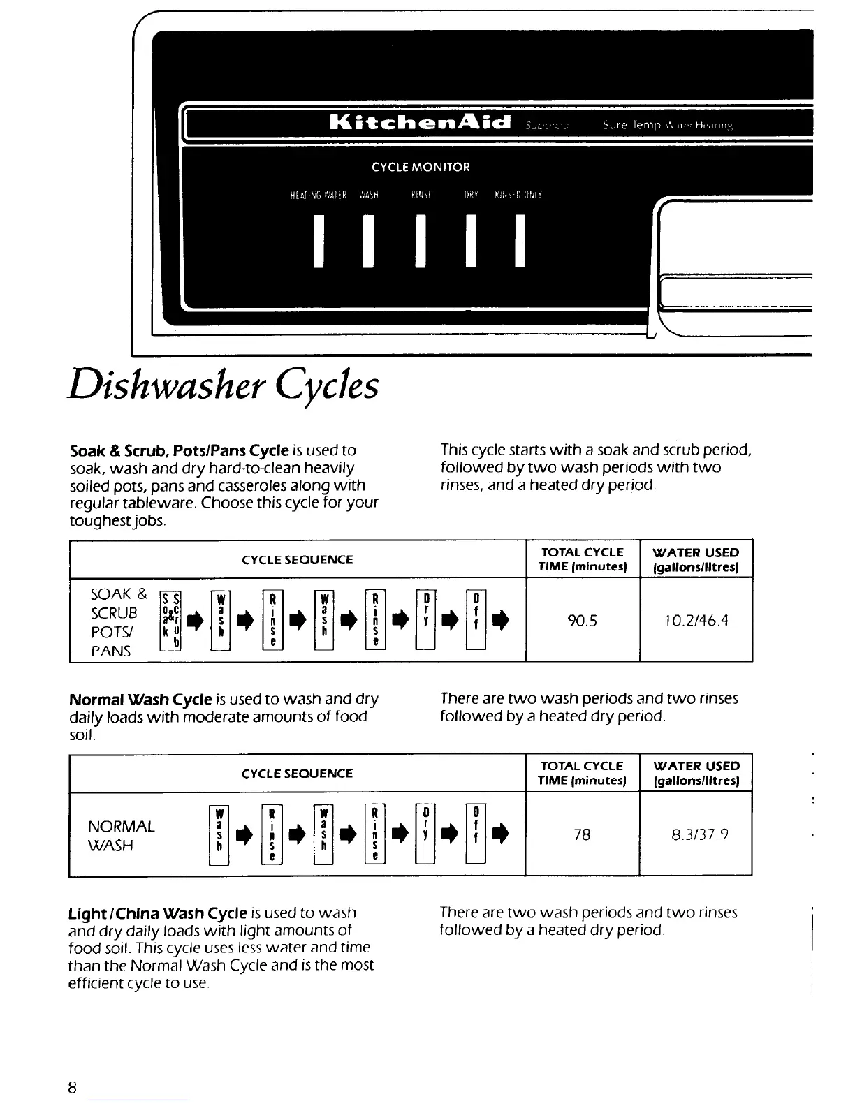 KitchenAid 4KUDA22OT - Dishwasher Cycles; Soak & Scrub, Pots;Pans Cycle; Normal Wash Cycle; Light;China Wash Cycle