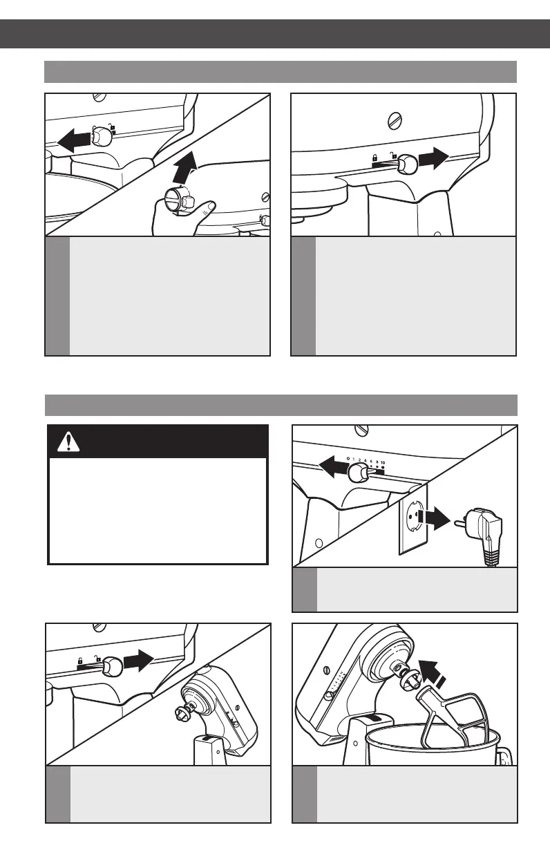Bevestiging/verwijdering van de platte menghaak, de draadgarde of de kneedhaak