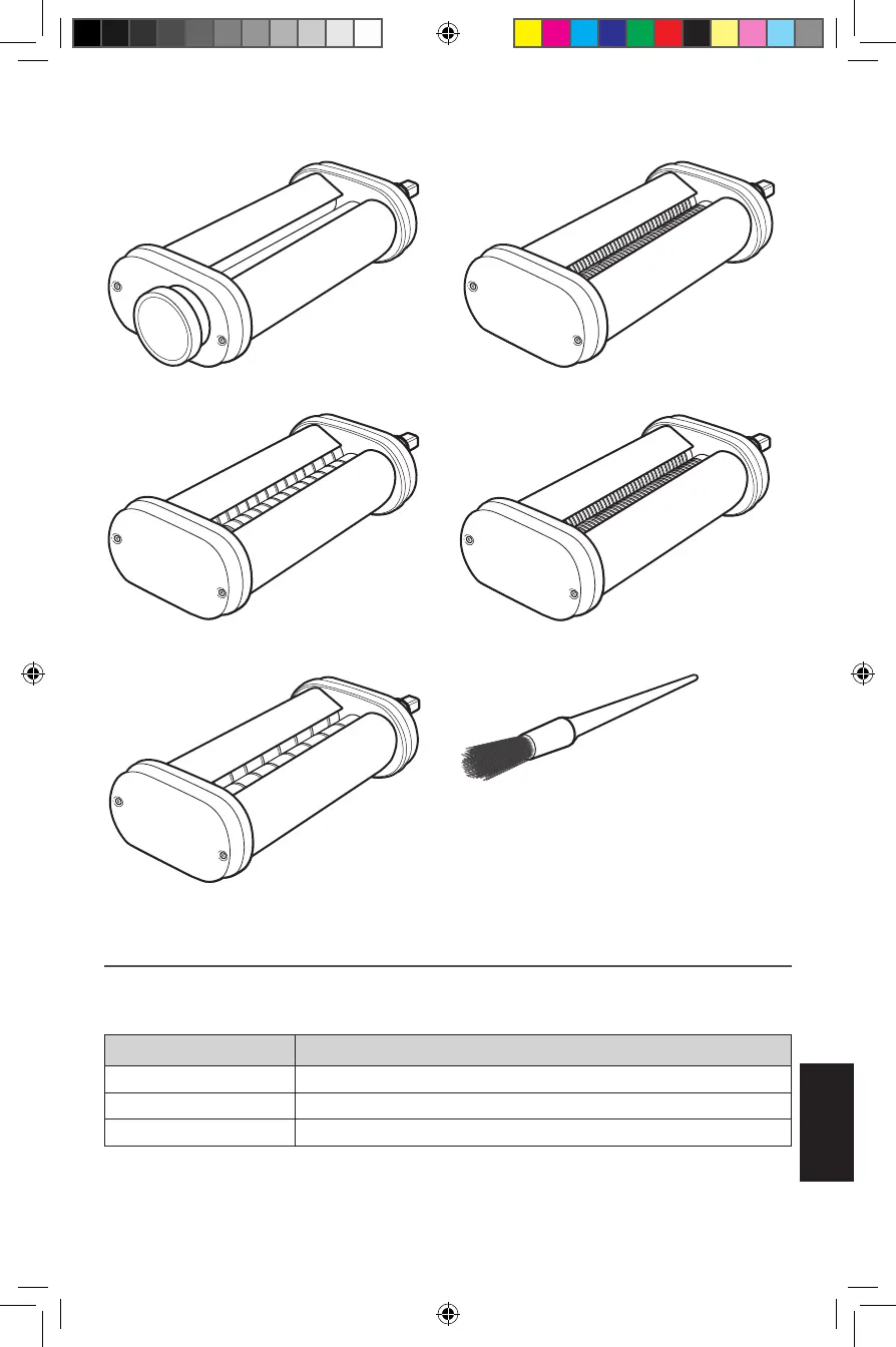Använd den här tabellen för att snabbt se vilka valsar och/eller skärare som medföljer