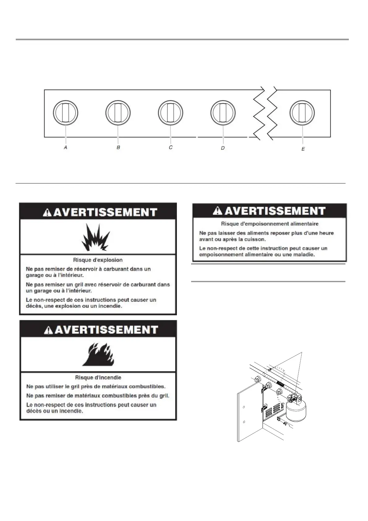 C. Bouton du brûleur de centre-droit du gril D. Bouton du brûleur de droite du gril