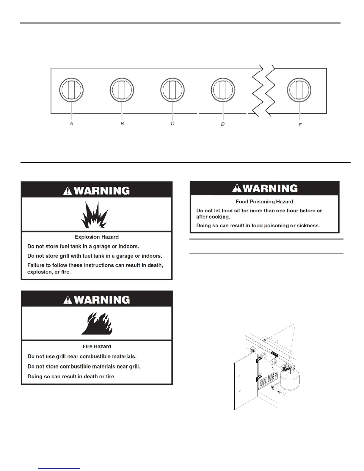 C. Right-center grill burner knob D. Right grill burner knob E. Sear burner knob
