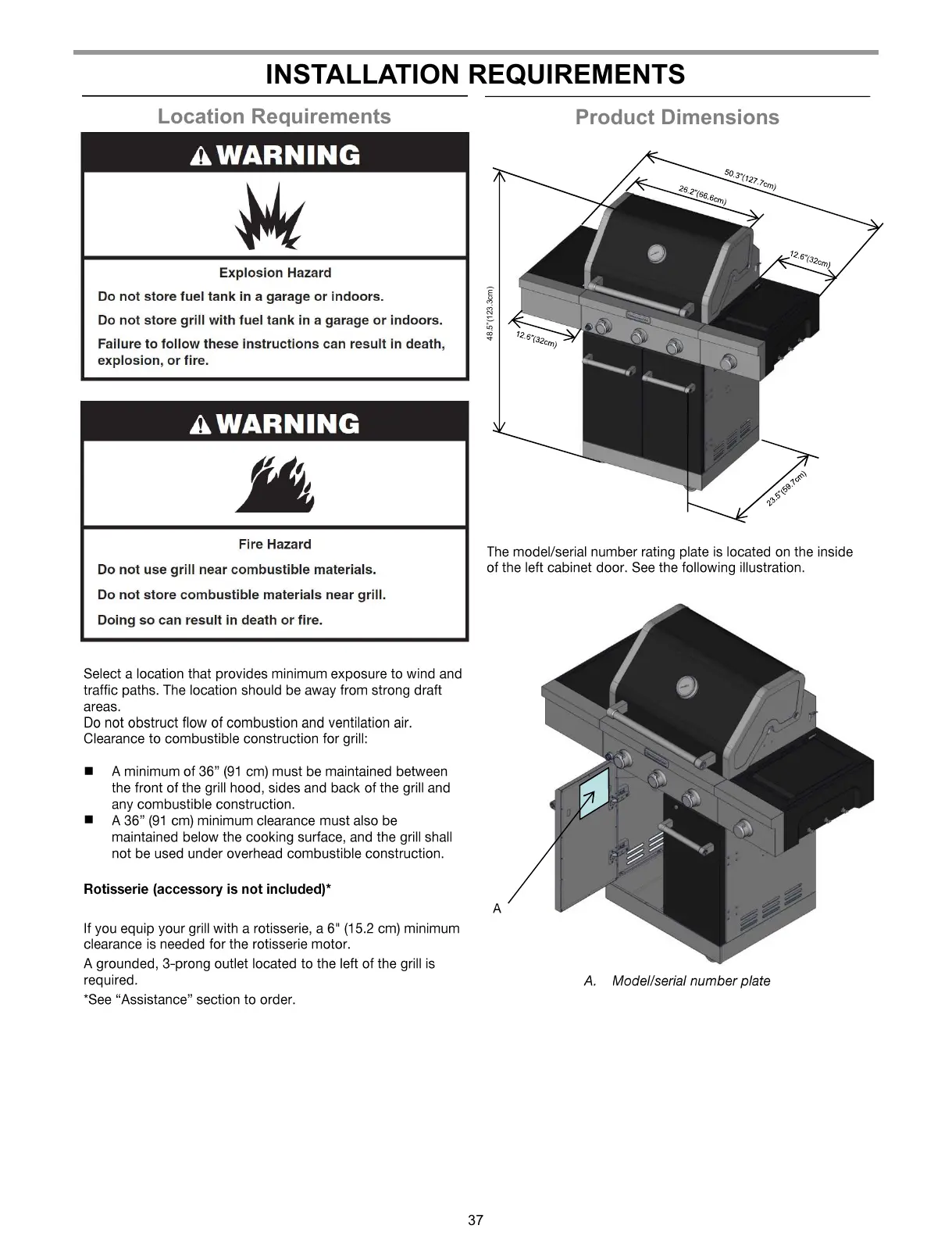 KitchenAid 720-0953 (LP) - Installation Requirements; Location Requirements; Product Dimensions; Model;Serial Number Plate Location