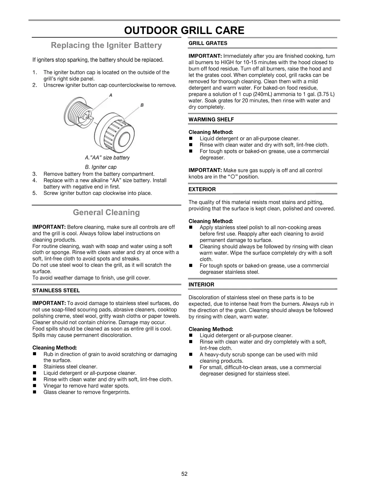 KitchenAid 720-0953 (LP) - Outdoor Grill Care and Maintenance; Igniter Battery Replacement; General Cleaning Procedures; Stainless Steel and Interior Care