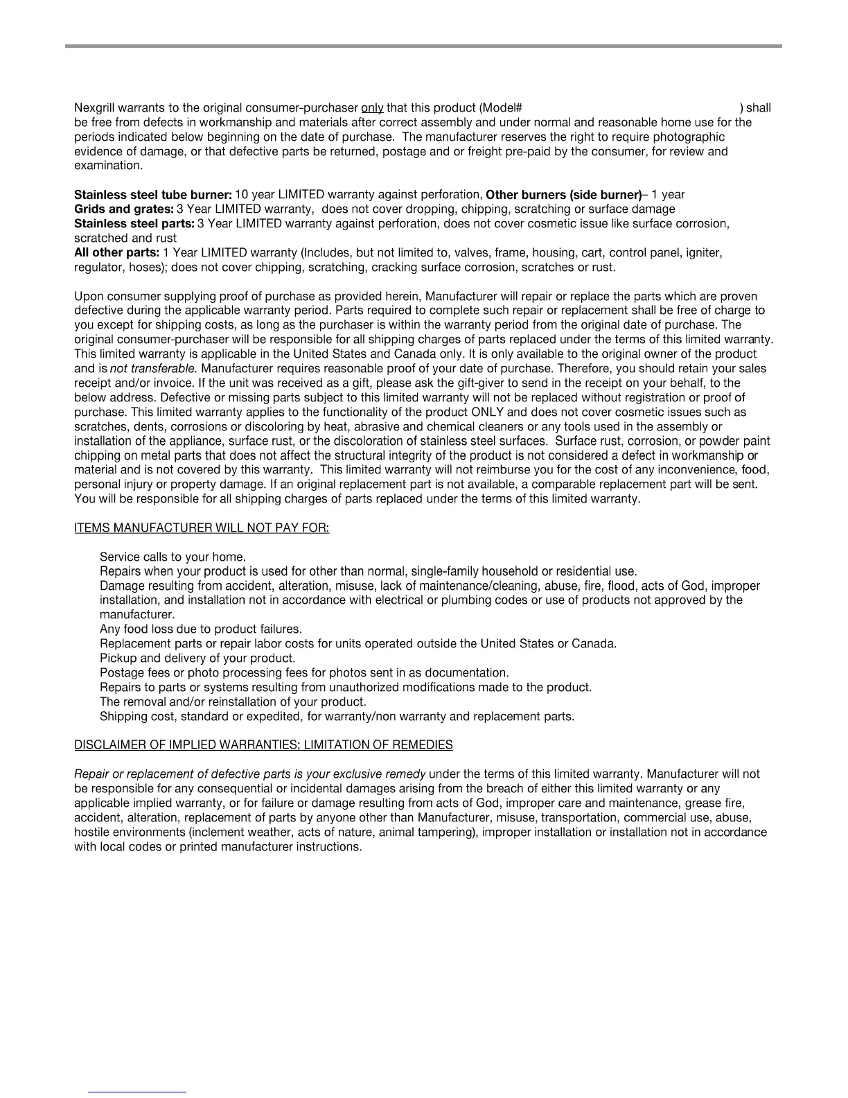 LIMITED WARRANTY (Model # 720-0953/0953B/0953C/0953E/0953F)