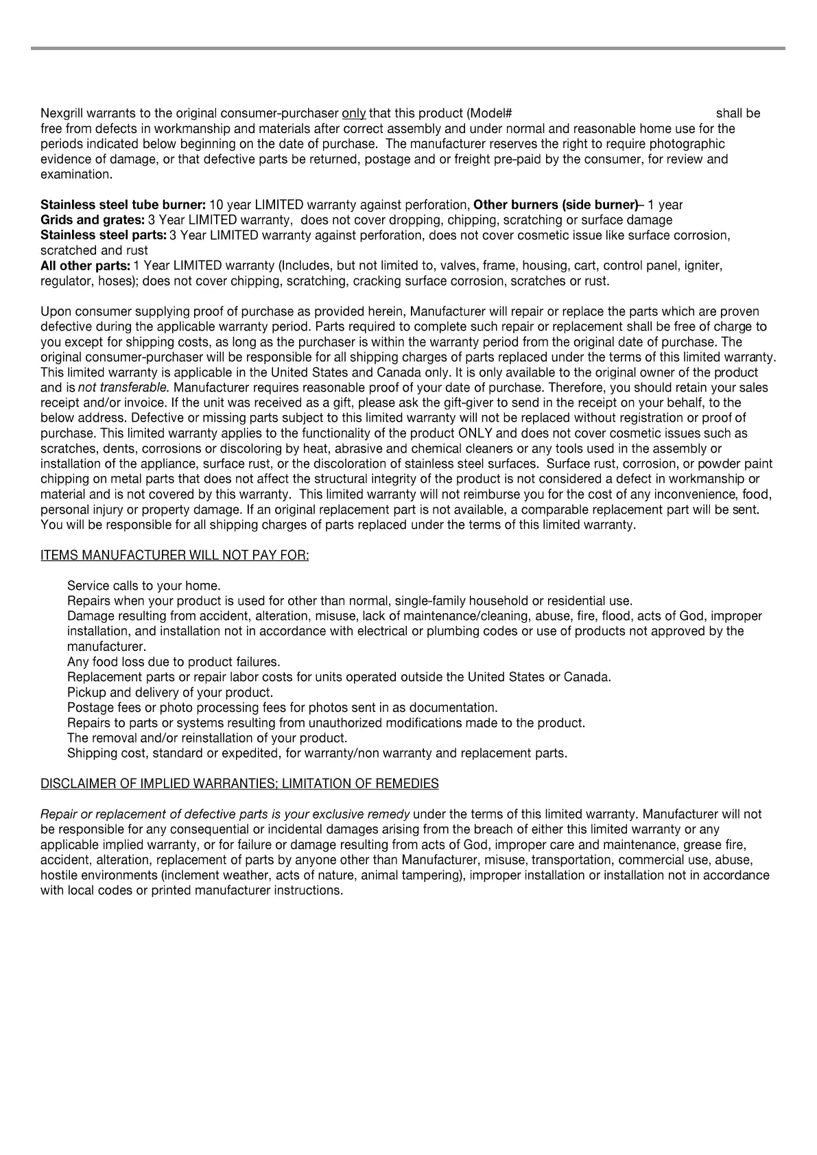 LIMITED WARRANTY (Model # 720-0953A/0953D/0953G/0953M)