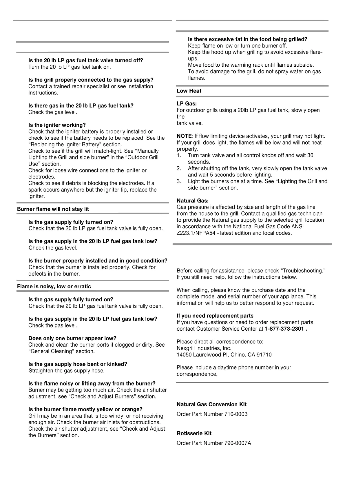 KitchenAid 720-0954 - TROUBLESHOOTING; Grill will not light; Burner flame will not stay lit; Flame is noisy, low or erratic