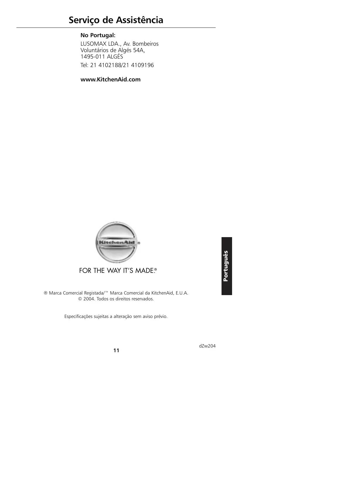 ® Marca Comercial Registada/™ Marca Comercial da KitchenAid, E.U.A.