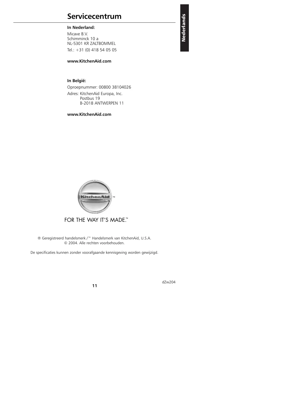 ® Geregistreerd handelsmerk /™ Handelsmerk van KitchenAid, U.S.A.