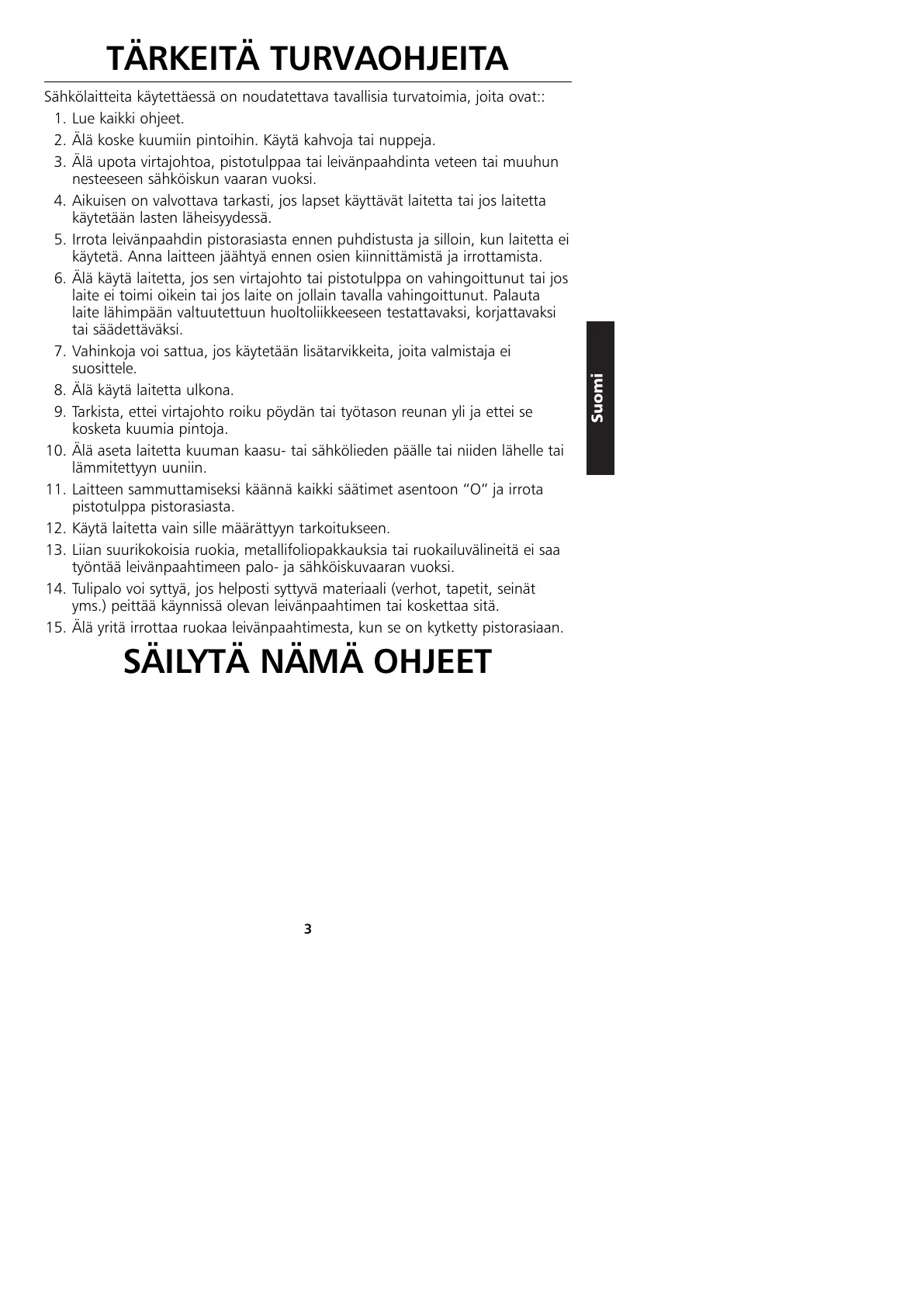 3. Älä upota virtajohtoa, pistotulppaa tai leivänpaahdinta veteen tai muuhun
