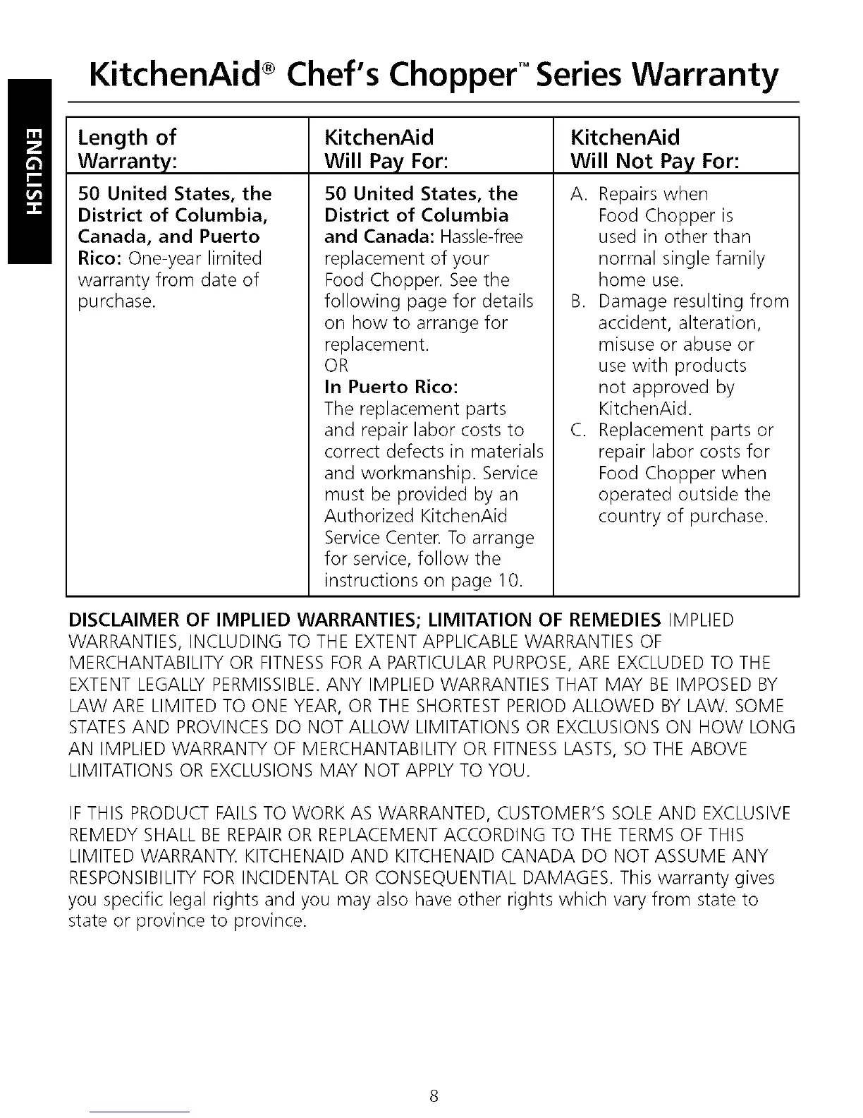 KitchenAid ®Chef's Choppe¢ °Series Warranty
