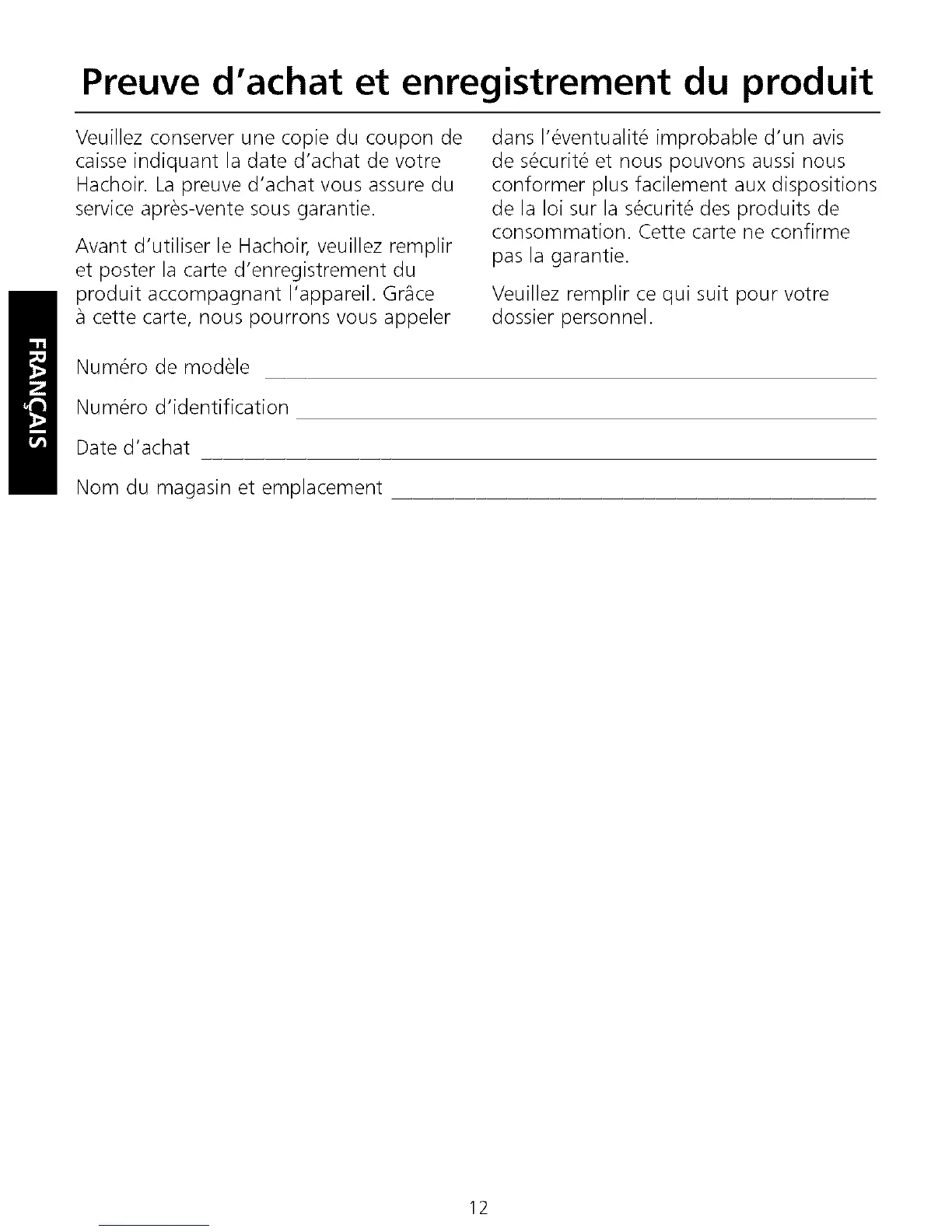 Avant d'utiliser le Hachoir, veuillez remplir