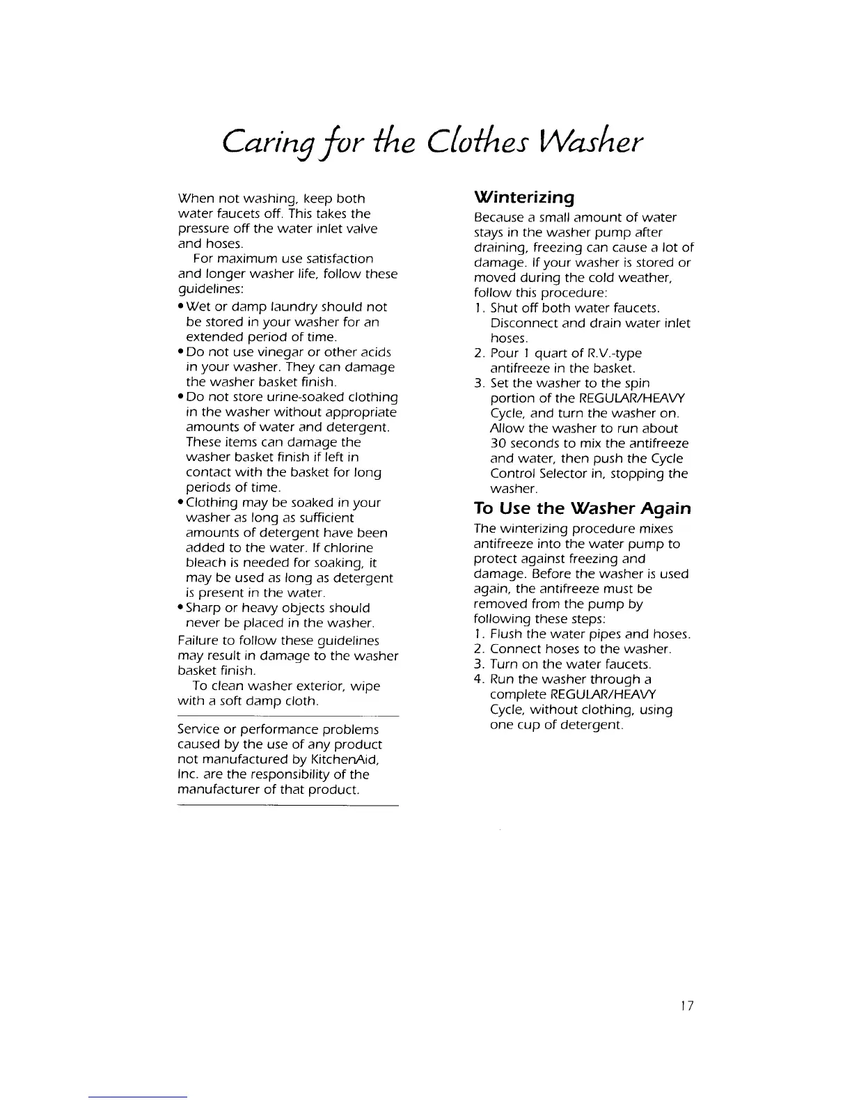 KitchenAid KAWE755V - Caring for the Clothes Washer; Winterizing