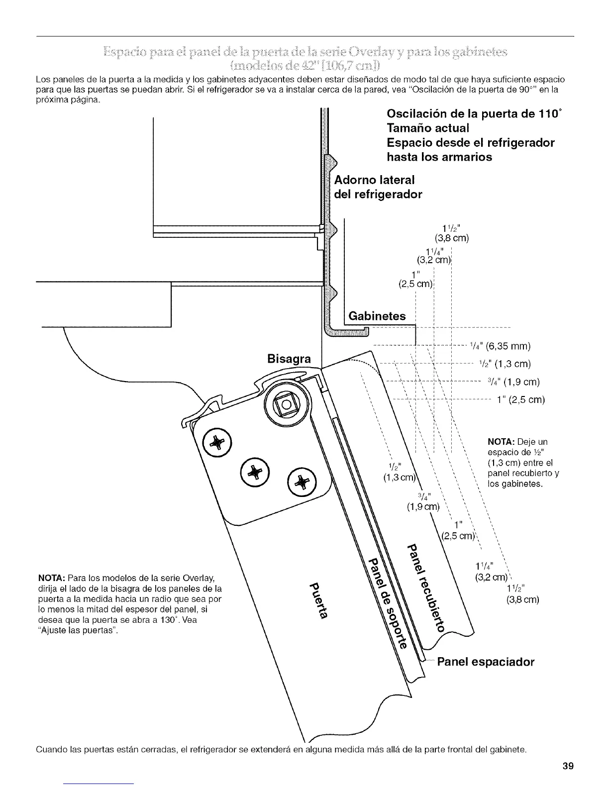 Cuando las puertas estan cerradas, el refrigerador se extendera en alguna medida mas alia de la parte frontal del gabinete.