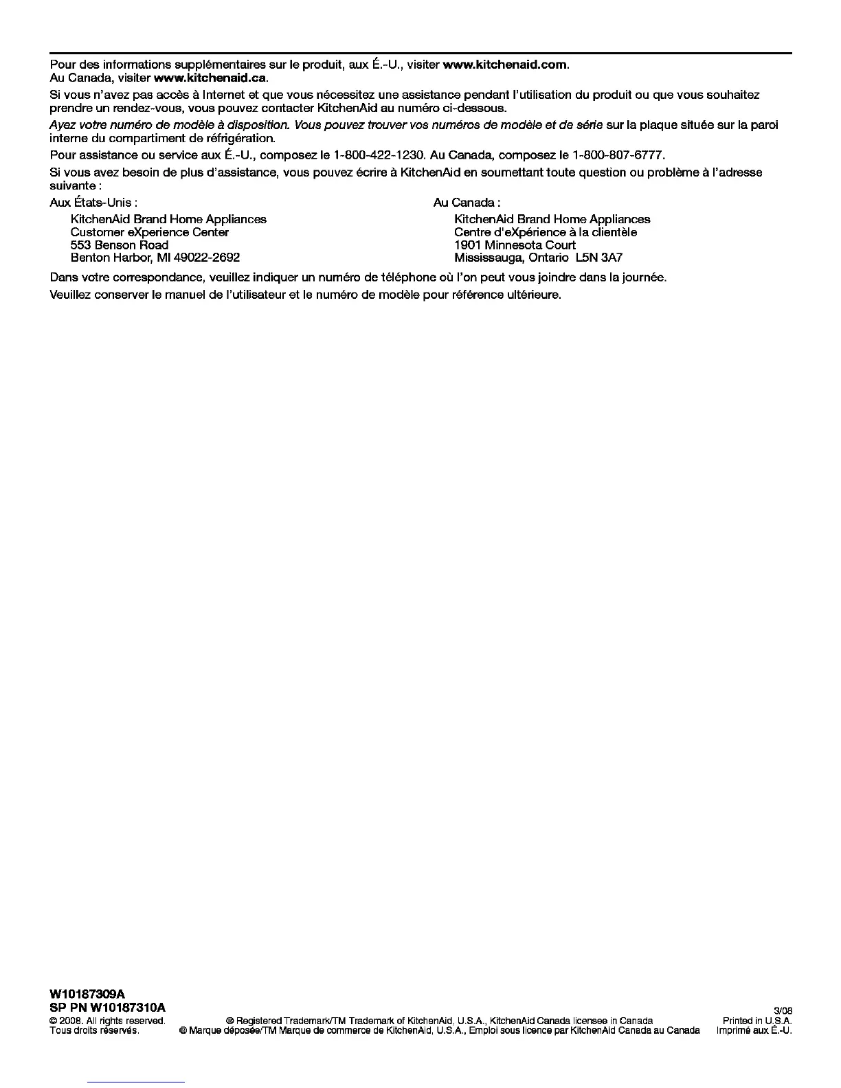 Pour des informations suppl6mentaires sur le produit, aux I_.-U., visiter www.kitchenaid.com.