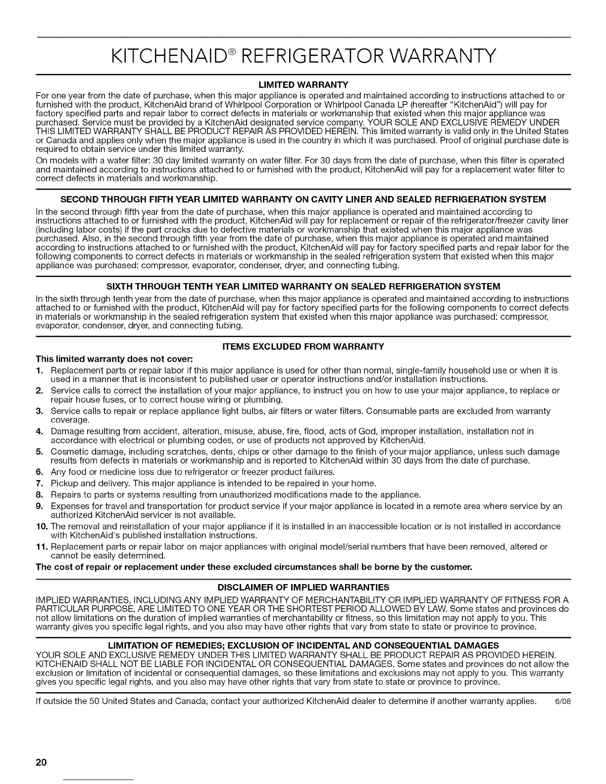 If outside the 50 United States and Canada, contact your authorized KitchenAid dealer to determine if another warranty applies. 6/08