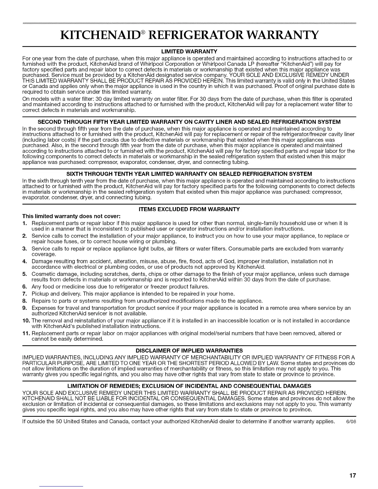 If outside the 50 United States and Canada, contact your authorized KitchenAid dealer to determine if another warranty applies. 6/08