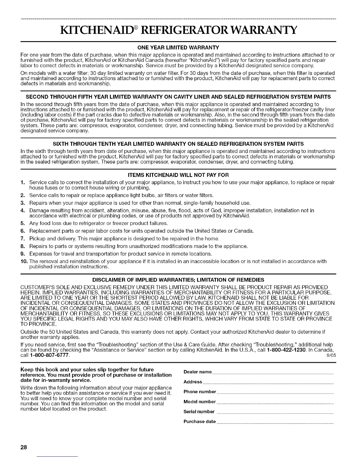 KITCHENAID ®REFRIGERATOR WARILANTY