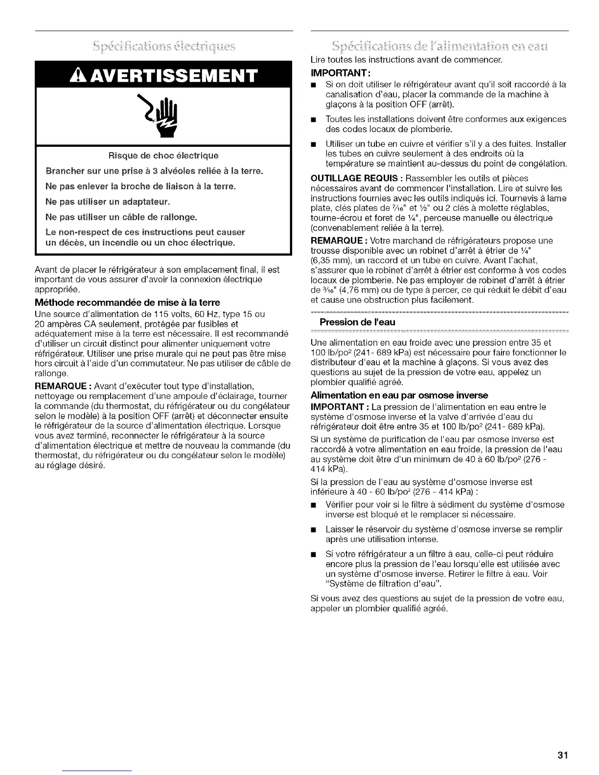 • Si on dolt utiliser le refrig6rateur avant qu'il soit raccorde a la