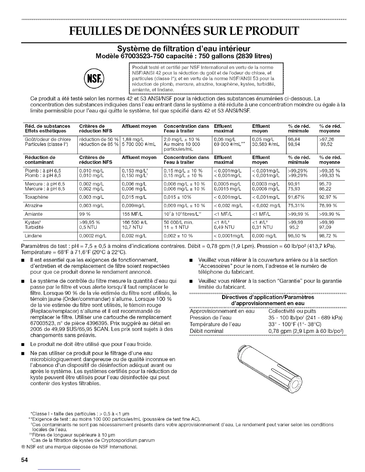limite permissible pour I'eau qui quitte le systeme, tel que specifie dans 42 et 53 ANSl/NSF.
