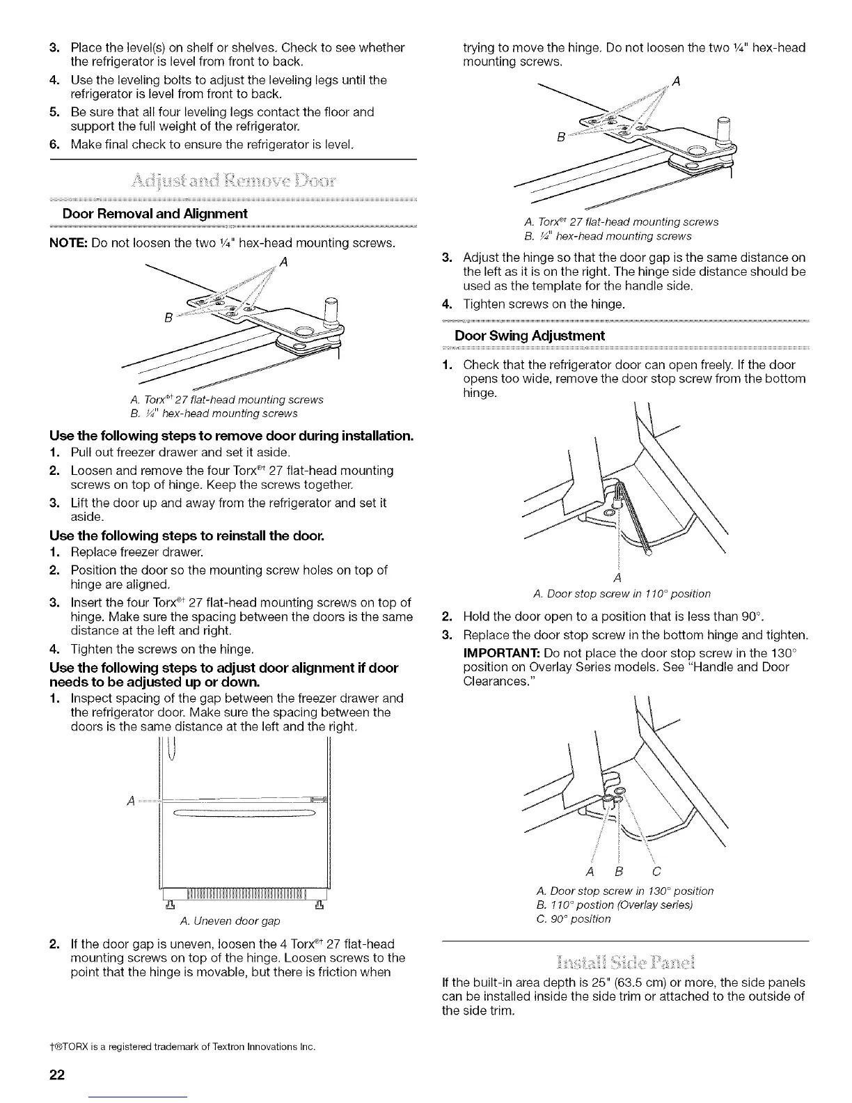 KitchenAid KBLC36FMS00 - Adjust and Remove Door; Door Removal and Alignment; Door Swing Adjustment; Install Side Panel