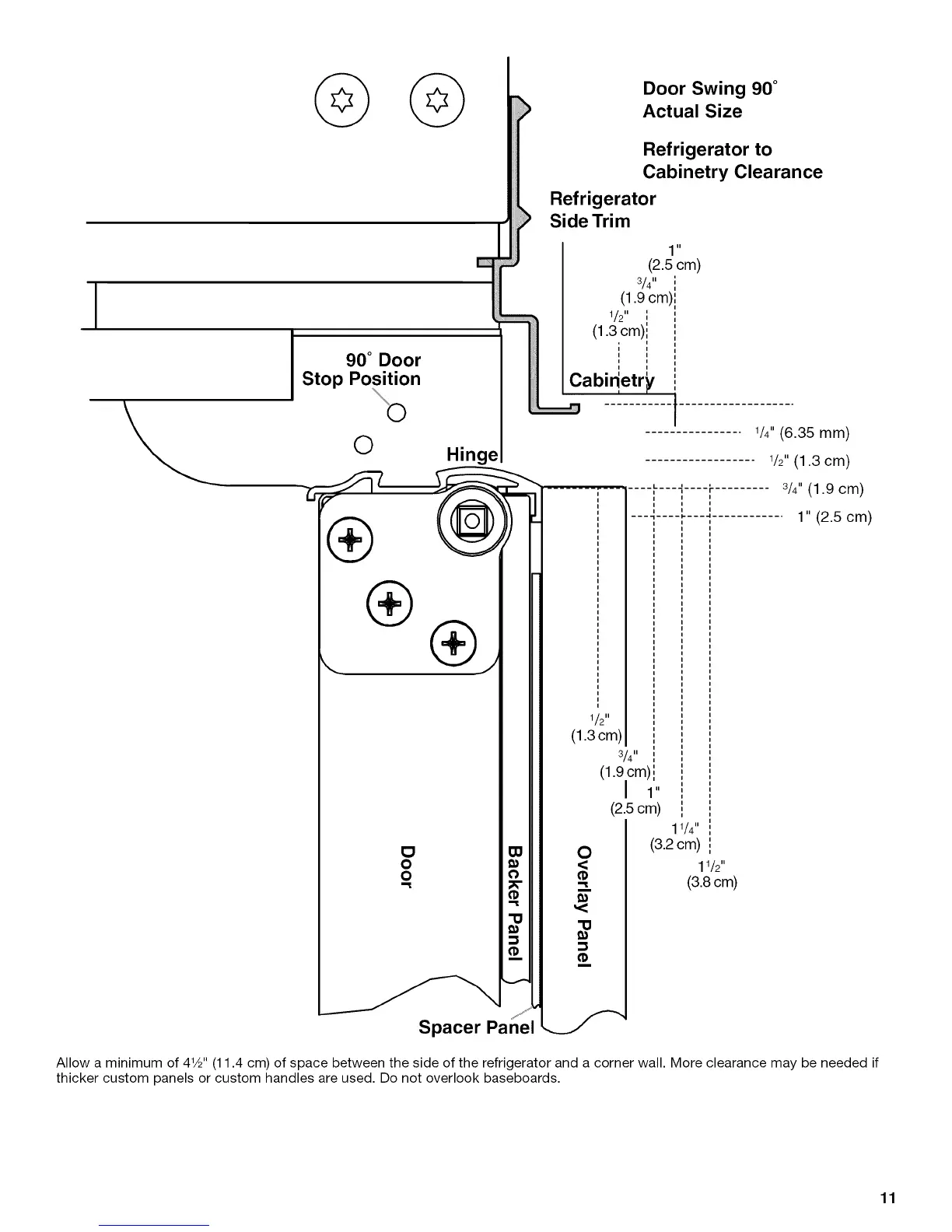 Allow a minimum of 41/2"(11.4 cm) of space between the side of the refrigerator and a corner wall. More clearance may be needed if