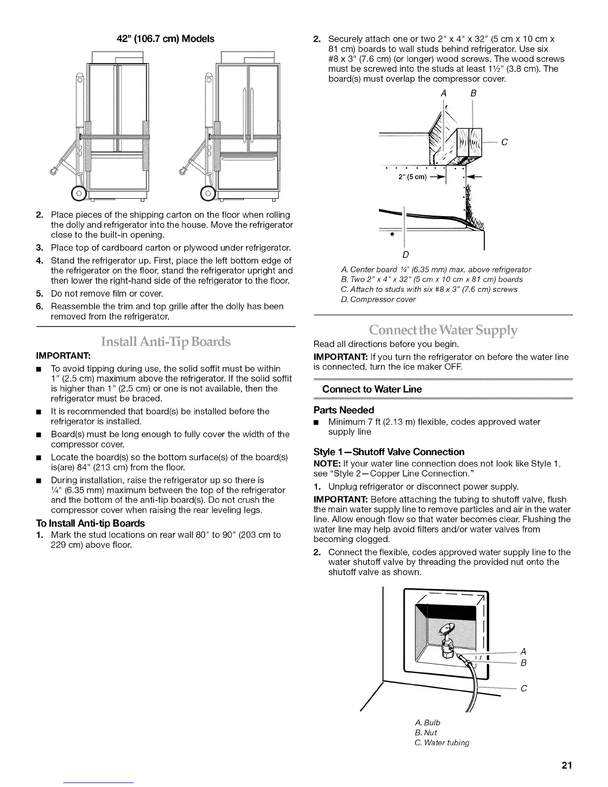 and the bottom of the anti-tip board(s). Do not crush the