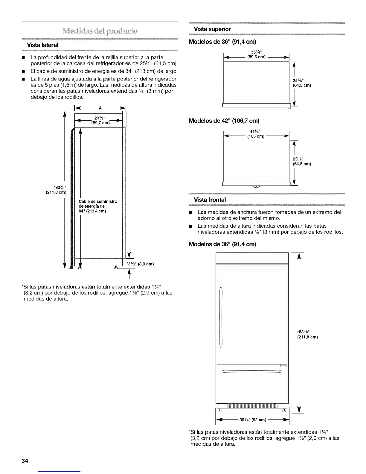 • El cable de suministro de energia es de 84" (213 cm) de largo.