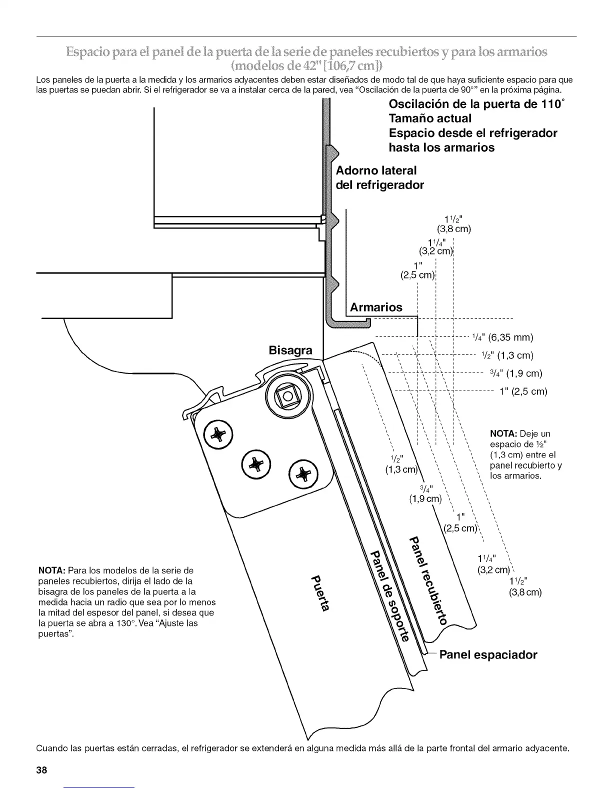 Cuando las puertas estan cerradas, el refrigerador se extenderA en alguna medida m_s alia de la parte frontal del armario adyacente.