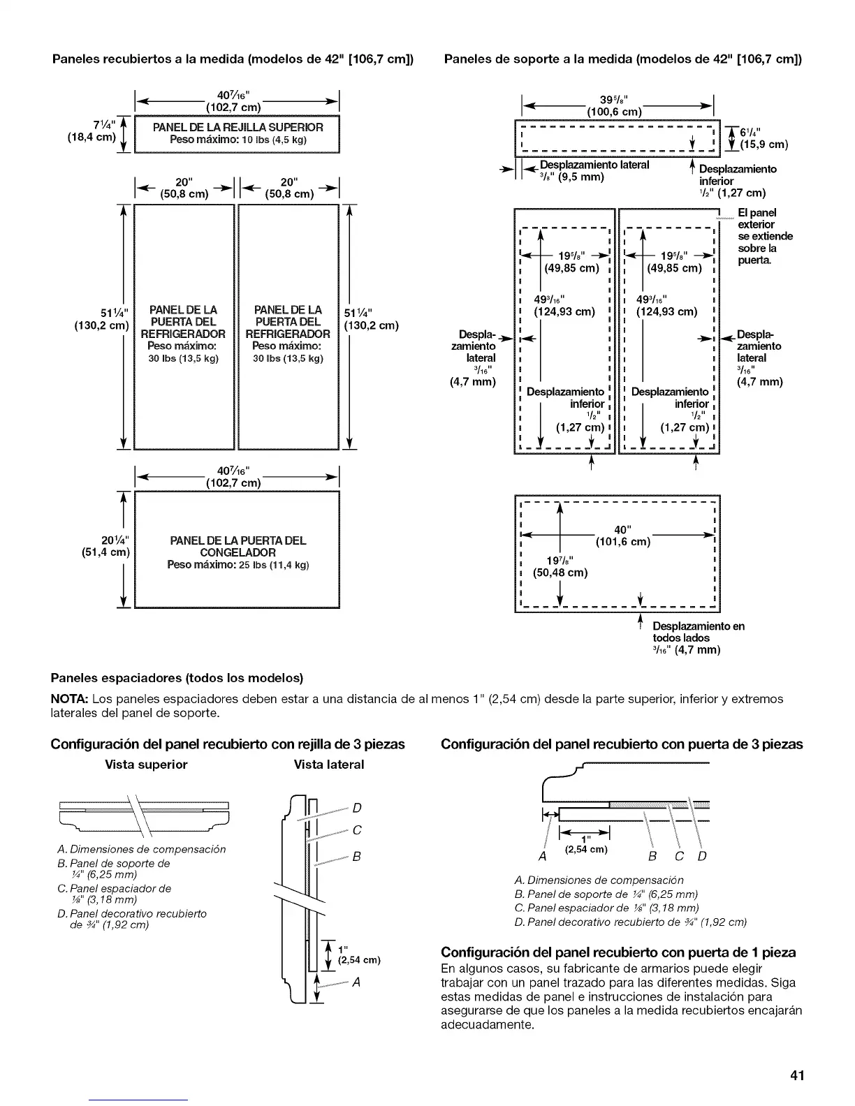Paneles recubiertos a la medida (modelos de 42" [106,7 cm]) Paneles de soporte a la medida (modelos de 42" [106,7 cm])