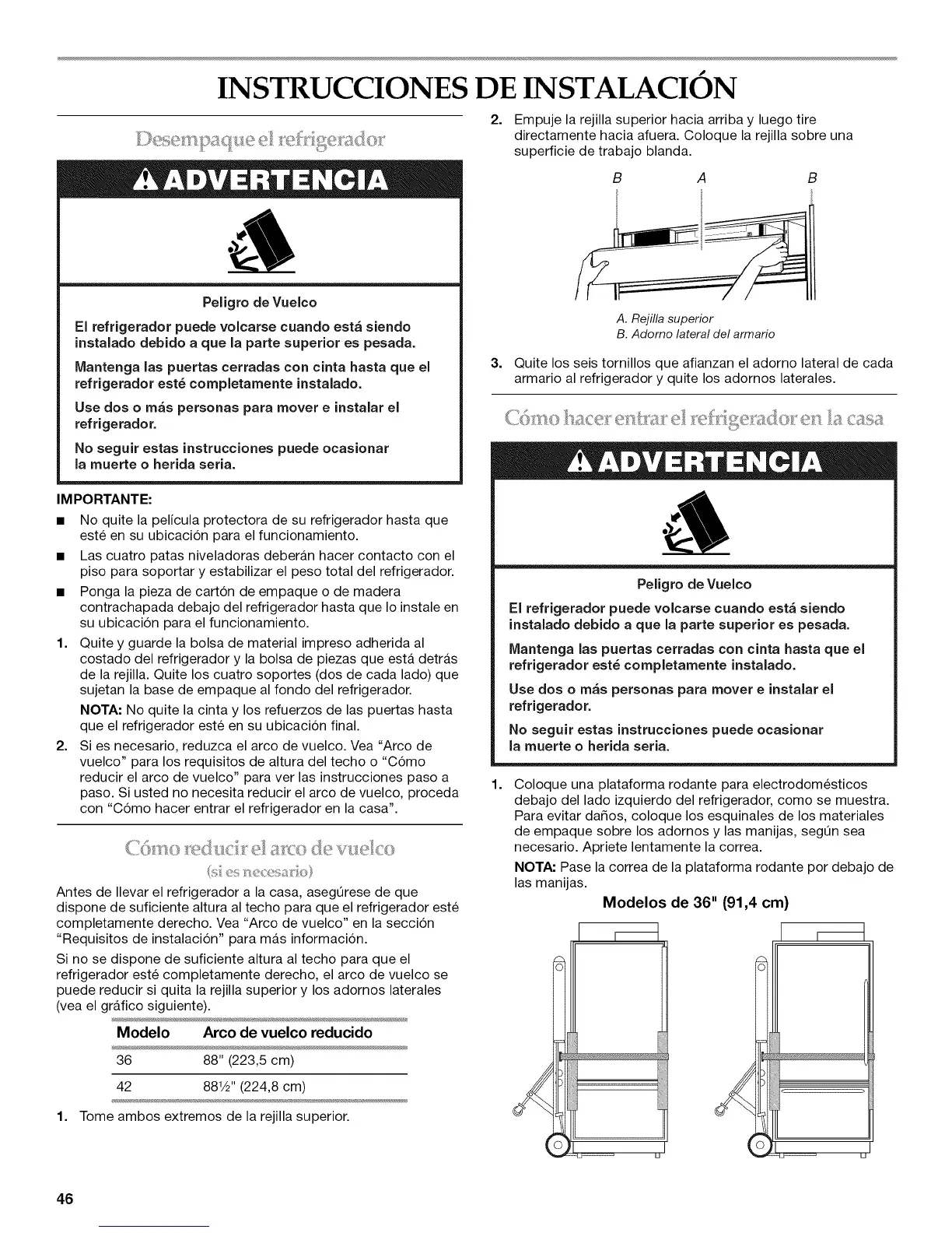 refrigerador este completamente derecho, el arco de vuelco se