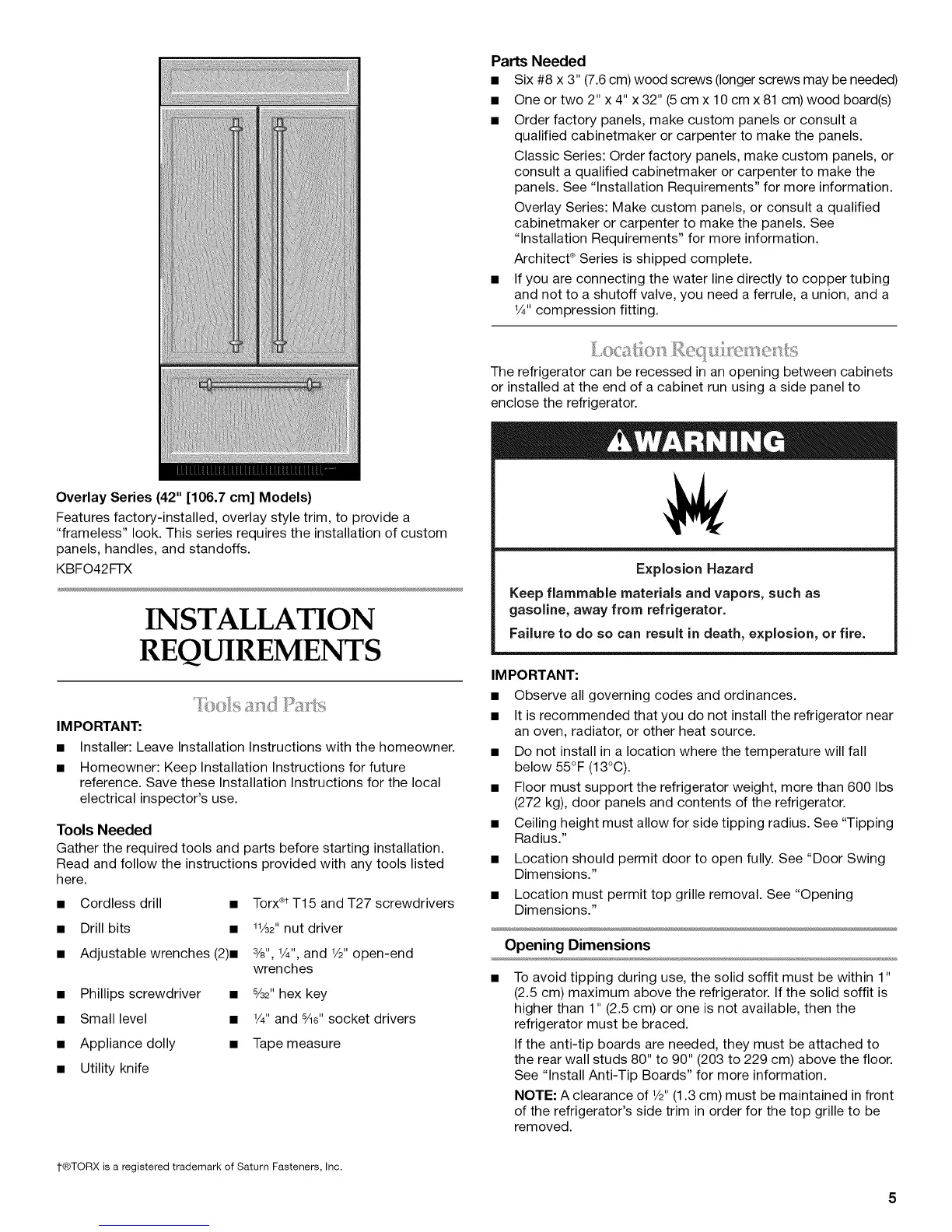 • Floor must support the refrigerator weight, more than 600 Ibs