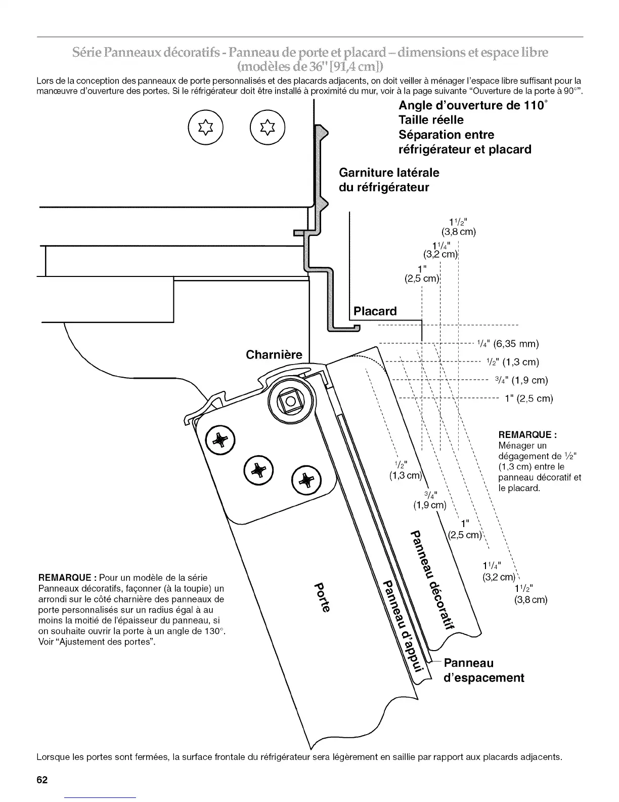 Lorsque les portes sont fermees, la surface frontale du refrigerateur sera legerement en saillie par rapport aux placards adjacents.