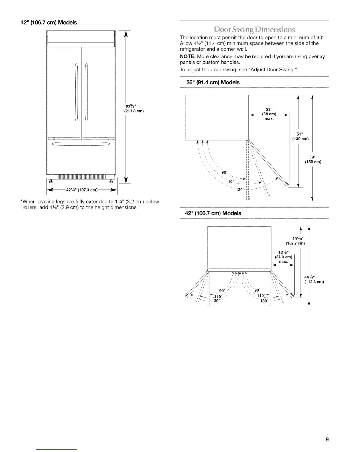*When leveling legs are fully extended to 1V4"(3.2 cm) below