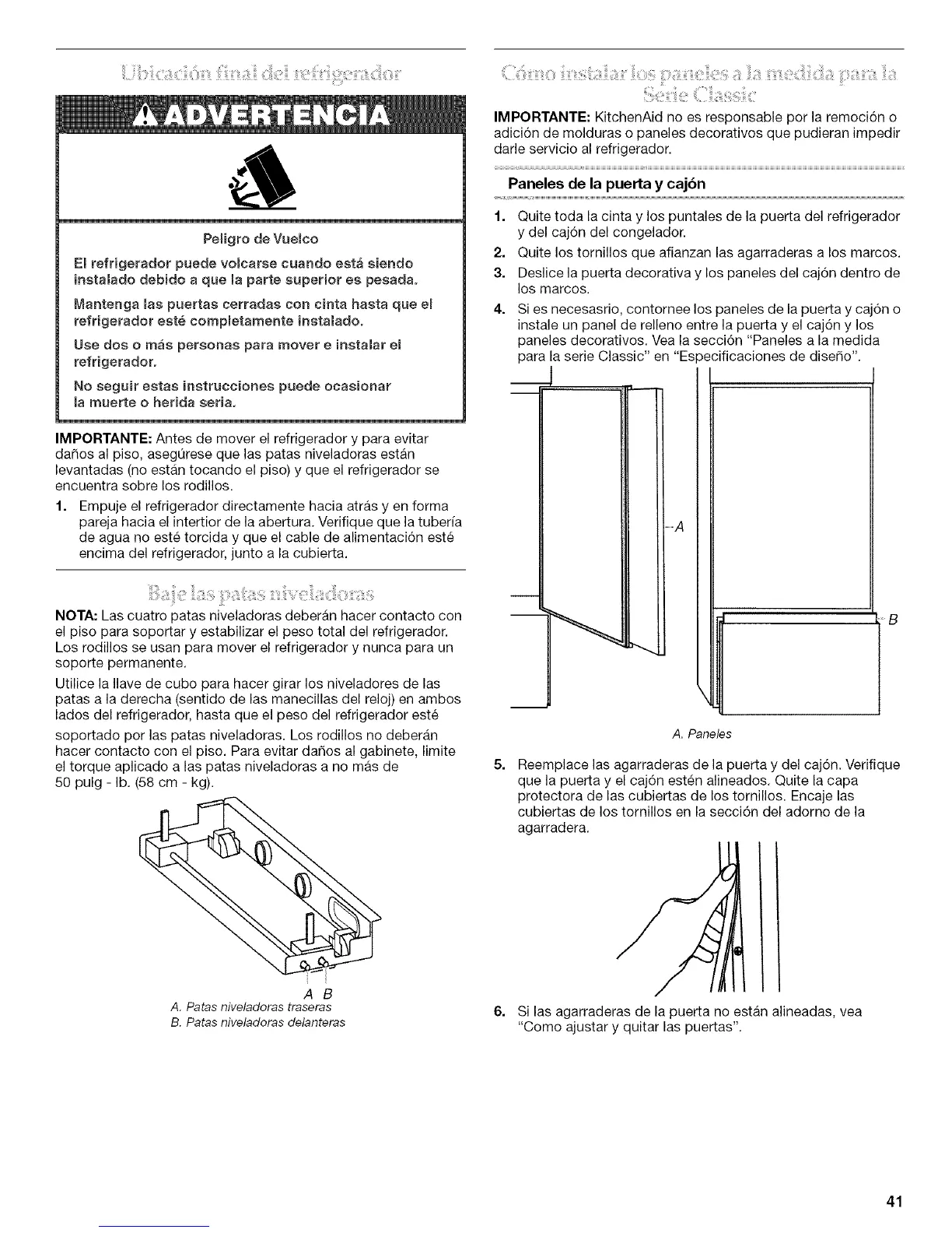 el piso para soportar y estabilizar el peso total del refrigerador.