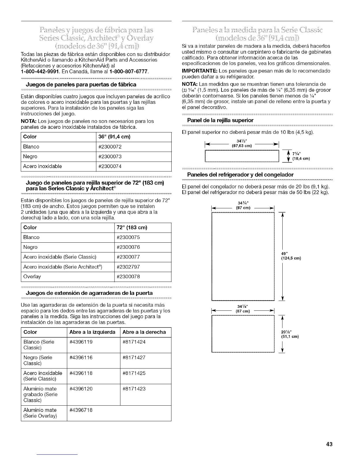 El panel del refrigerador no debera pesar mas de 50 Ibs (22 kg).