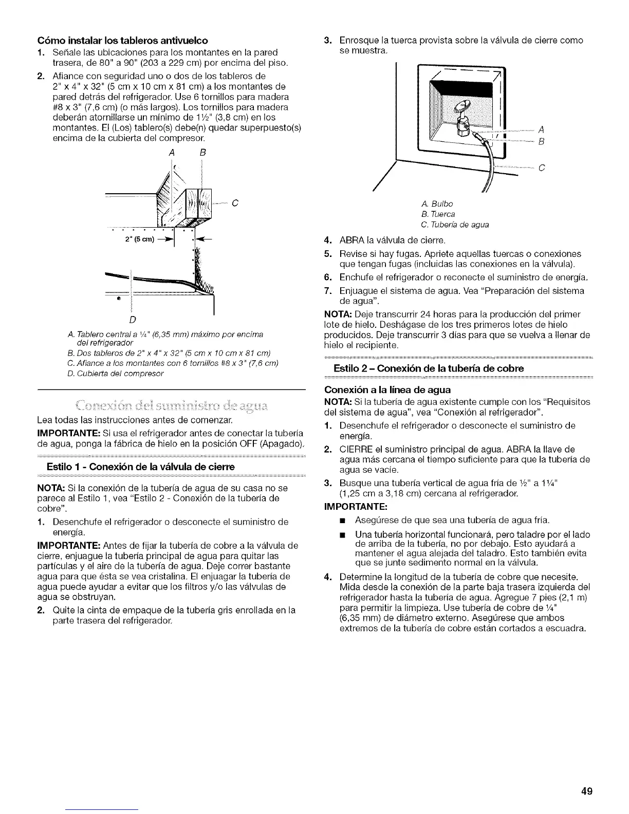 del sistema de agua", yea "Conexi6n al refrigerador".