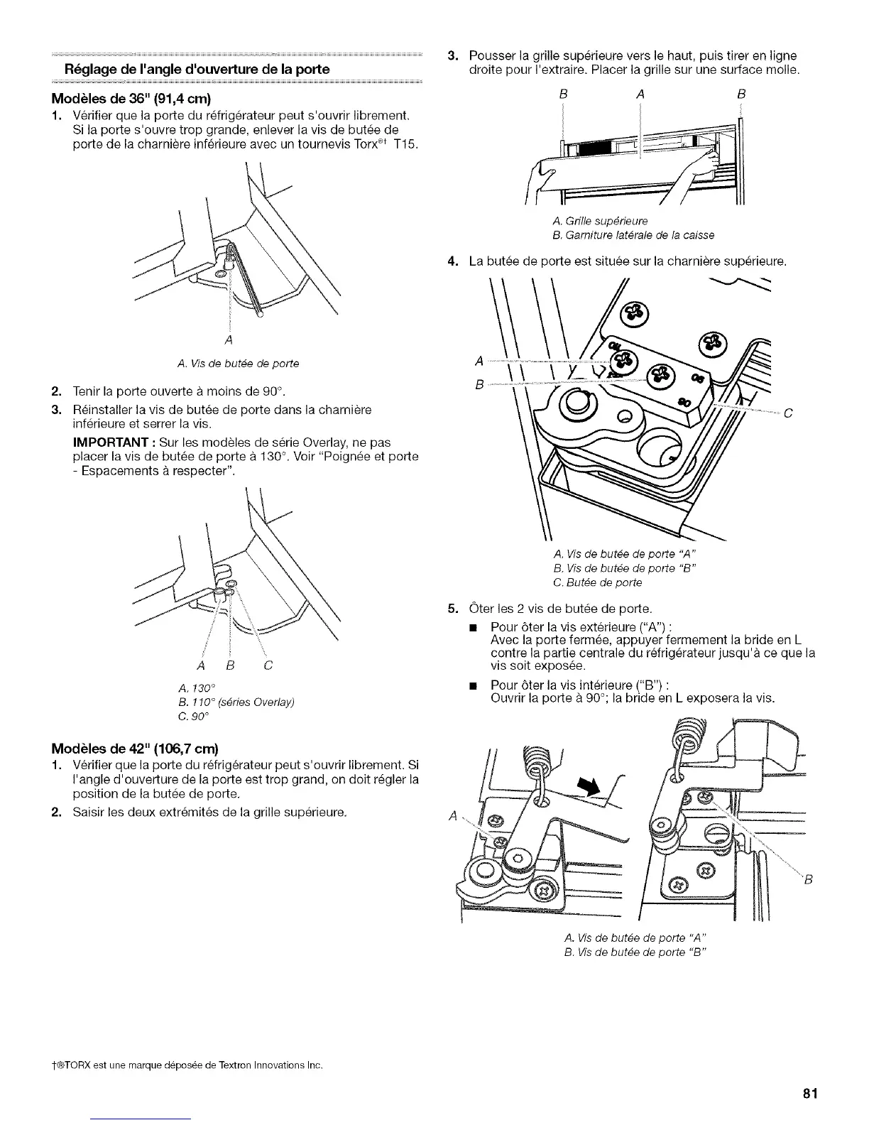 placer la vis de butee de porte a 130 °. Voir "Poignee et porte