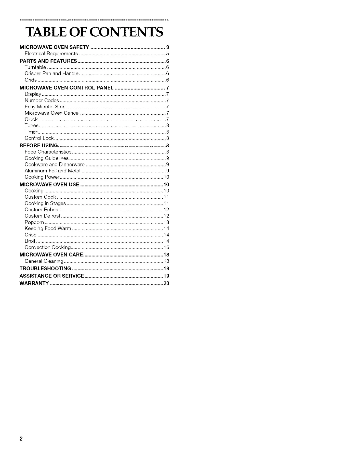 MICROWAVE OVEN CARE .......................................................... 18