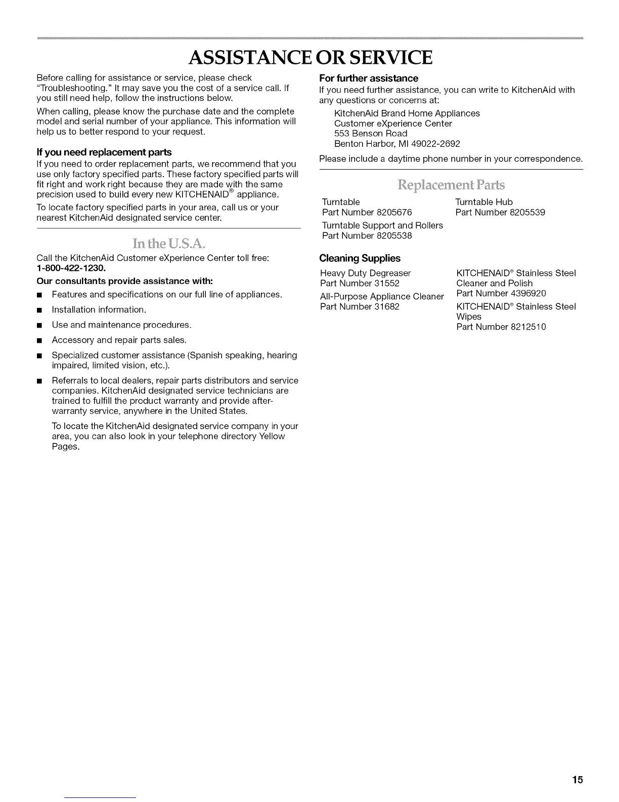 Call the KitchenAid Customer eXperience Center toll free:
