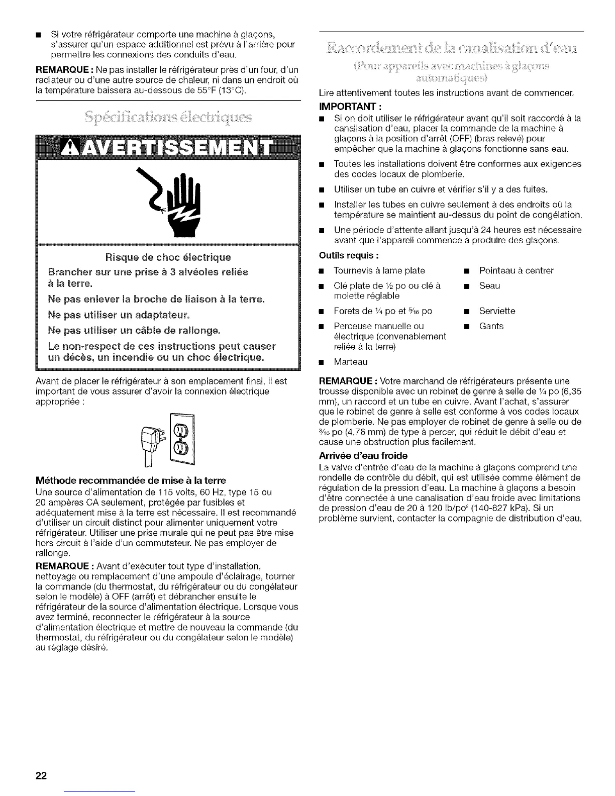• Si on dolt utiliser le refrigerateur avant qu'il soit raccorde a la