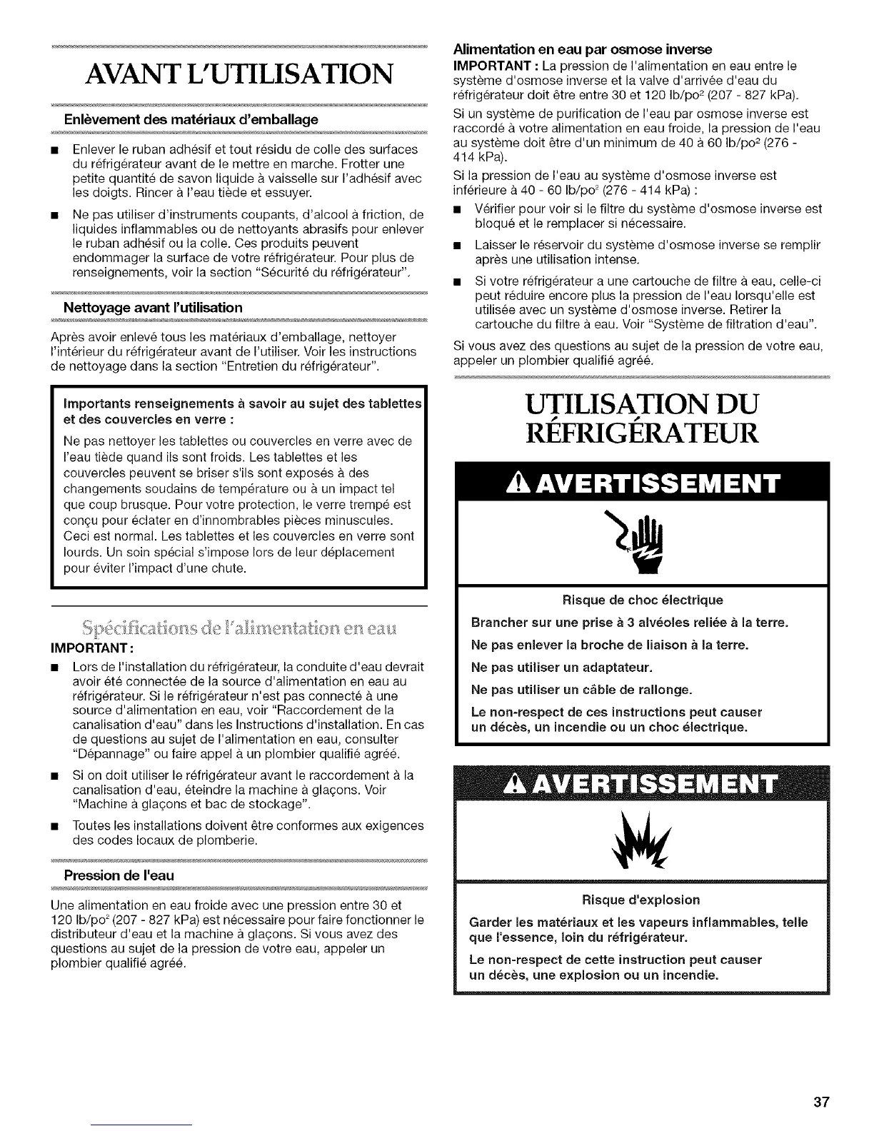 refrigerateur dolt _tre entre 30 et 120 Ib/po 2 (207 - 827 kPa).